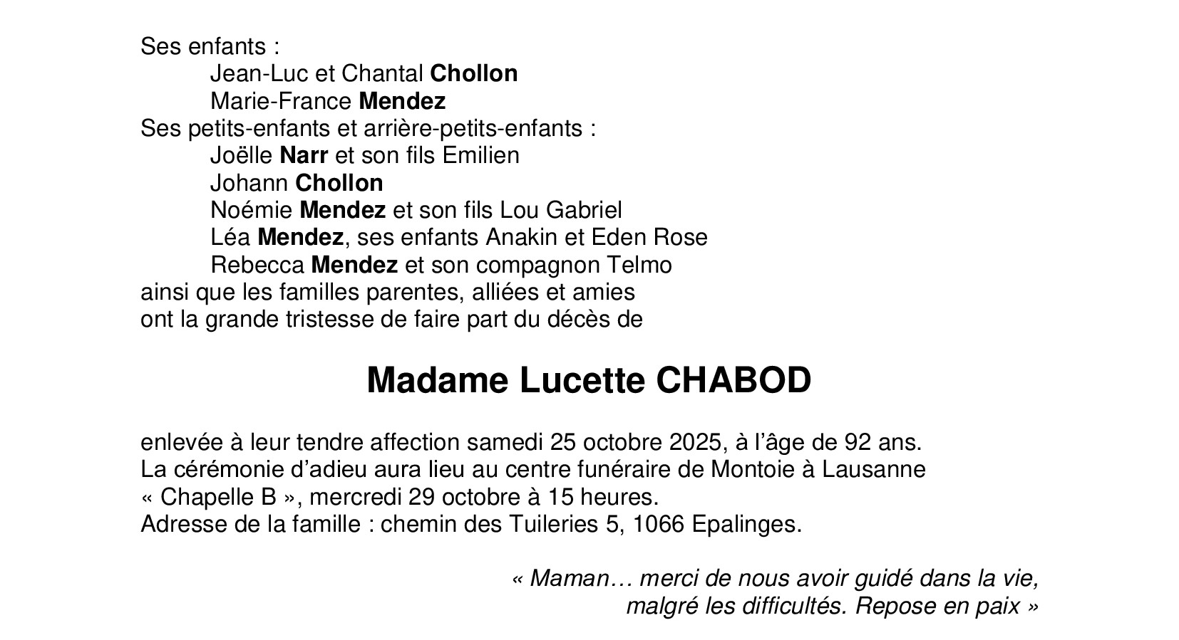 Madame Lucette CHABOD
